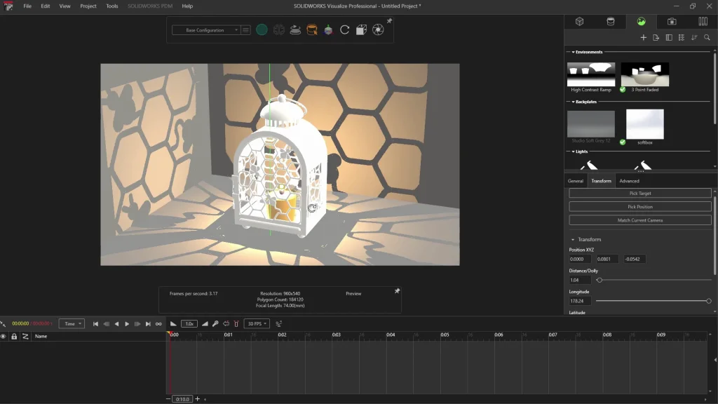 At the end of the design I created a basic corner room for the lantern to sit in for the rendering, this would show off how the lanterns shadows cast the design. The finished part is exported into SOLIDWOKRS Visualize. Here I could edit appearances further, add a light to the candle, and play around with its color, warmth, and brightness.