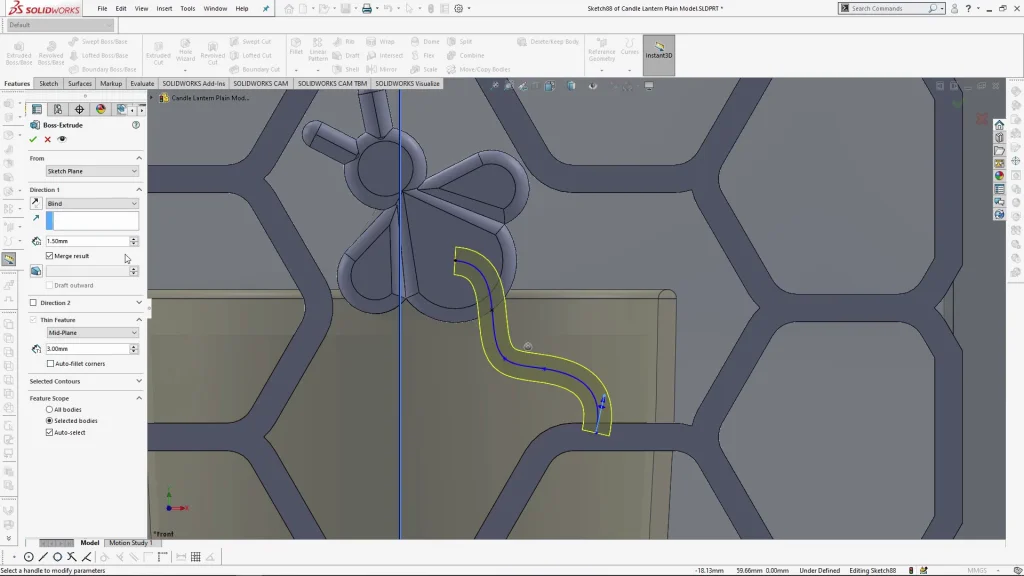 The converted hexagons are all selected, and keeping the feature un-merged from the lantern the individual thin feature parts are combined to each other using combine and add to create this honeycomb design. The DXF file is used as a guide for creating the bee, it involves basic extrusions, filleting the faces and combining the bodies into one. The bee is the copied and moved into the honeycomb spaces. The thin feature is used again to create bee trails which are used later on to join the bees to the window design.