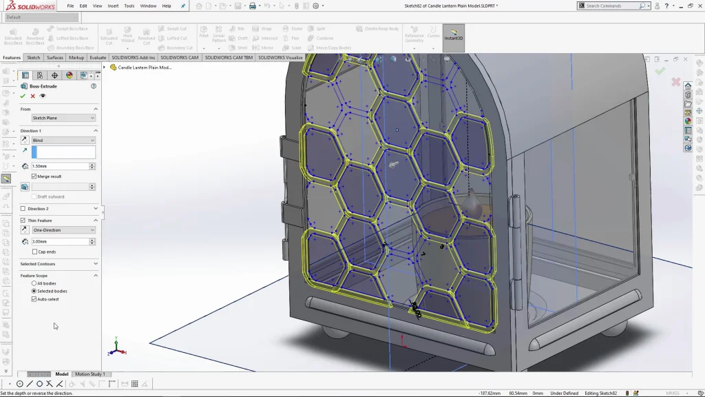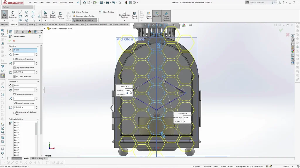 Welcome to this tutorial for a Candle Lantern,  you will need to download the files for Candle Lantern Tutorial here to follow the tutorial. You will begin with a plain lantern model, sketching onto the glass pane, the linear pattern is used to create a guide sketch of a honeycomb design. Individual elements are then selected and converted back into workable entities. Some hexagons are left as construction sketches, gaps are needed to fit bees into the gaps further on.