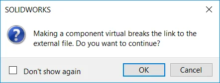 Note you will get a dialog that tells you that this will break a link to the external file. This is good and what we’re after here: we want to make a copy of the part in the assembly that is separate from the original part on disk.