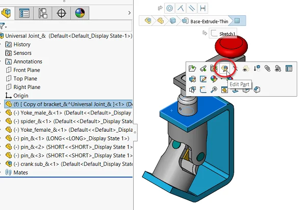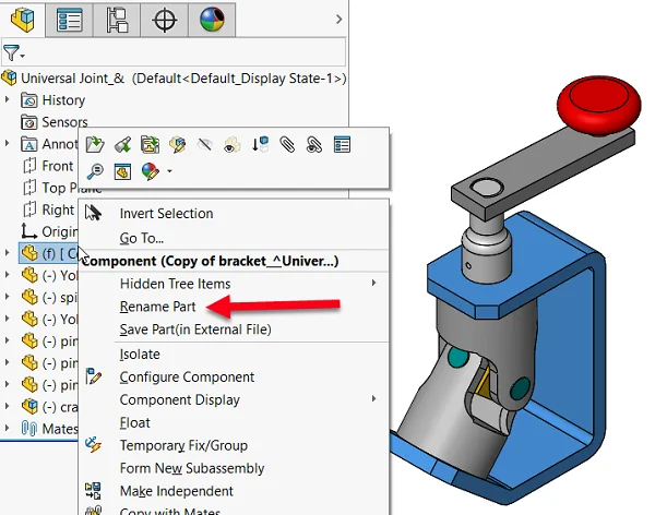 Once the part is copied and made virtual, you’ll see brackets appear around the component name in the FeatureManager. This means that the entirety of the part—all of its features—copied into the assembly. This copy is now separate from the original part on disk.