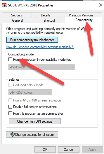 FInd the “sldworks.exe” file, and make sure that this file does not run in Compatibility mode, as described above