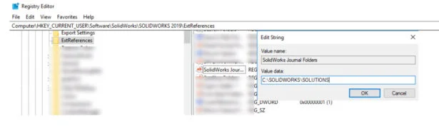 Find the path “HKEY_CURRENT_USER > software > SolidWorks > SolidWorks 20xx > ExtReferences” and locate the “SOLIDWORKS Journal folders” key. Double click on the “SOLIDWORKS Journal folders” key to determine the path to the journal folder.