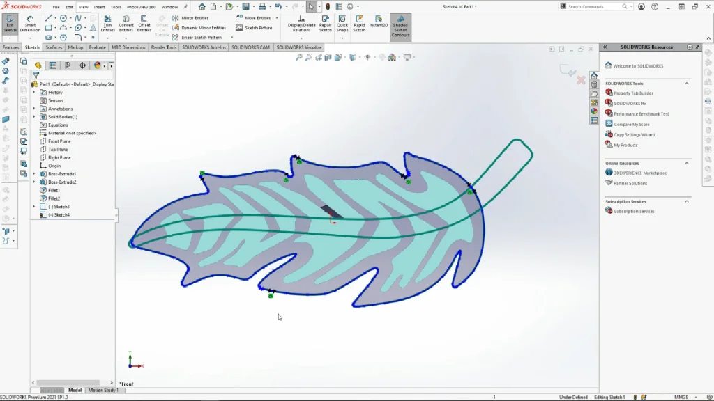 The next part to do, was start tracing over the outer shape of the leaf, to do this the spline tool was used, this is easiest to do in sections, and some parts had to be tweaked. but once the whole shape was created, tangent relations were added between joint spline to ensure the sketch was smooth. Its important when tracing that you try not to add too many spline points as this can make the fillets harder to do, or not work at all. The tracing of the shape does not need to be perfect.