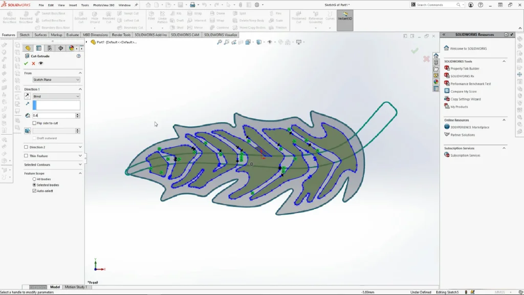 The sketch picture was also used to create the inner feather details using a cut extrude. and then the feather stem which was extruded. It is important when creating the traced sketches that each shape for the feather detail cut-outs become shaded, but also that the sketches are smooth, so if drawn out in separate splines or lines, you should add tangent relations before applying the cut extrude.