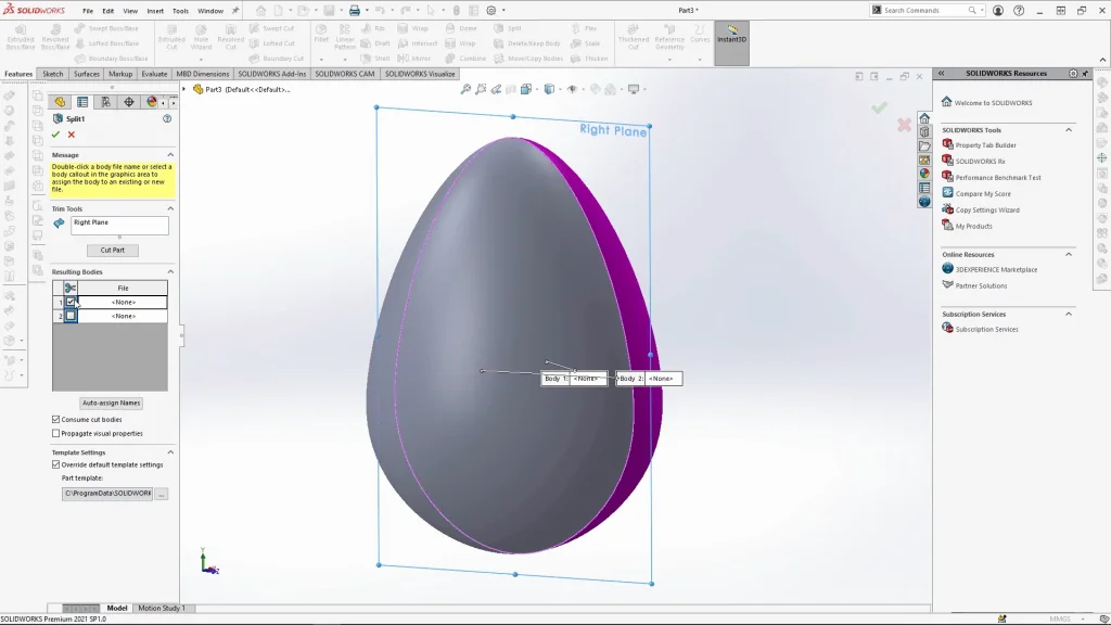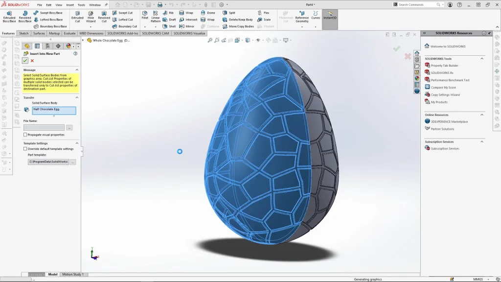 The wrap design was filled to soften the shapes and look like softer chocolate. The half shell was then mirrored over using mirror bodies, but merge result was unticked to keep both bodies separate. By doing this, I could save one of the half egg bodies into a new part from the solid bodies drop down. The reason for doing this is to create the assembly of the two chocolate egg halves, but also by saving the body into a new part, any changes made to the original egg part will apply to the half egg part too.