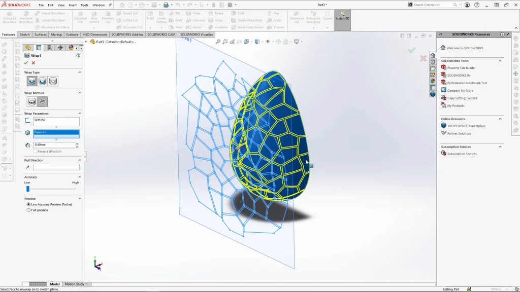 Once the DXF was imported onto the new plane, I closed the sketch, selected wrap, and change the wrap method to wrap on a spline surface. This is a very clever tool in SOLIDWORKS, I have quite a complex pattern which can it can wrap easily along this egg-like shape. The design was wrapped with an emboss, and goes off the edge of the egg.