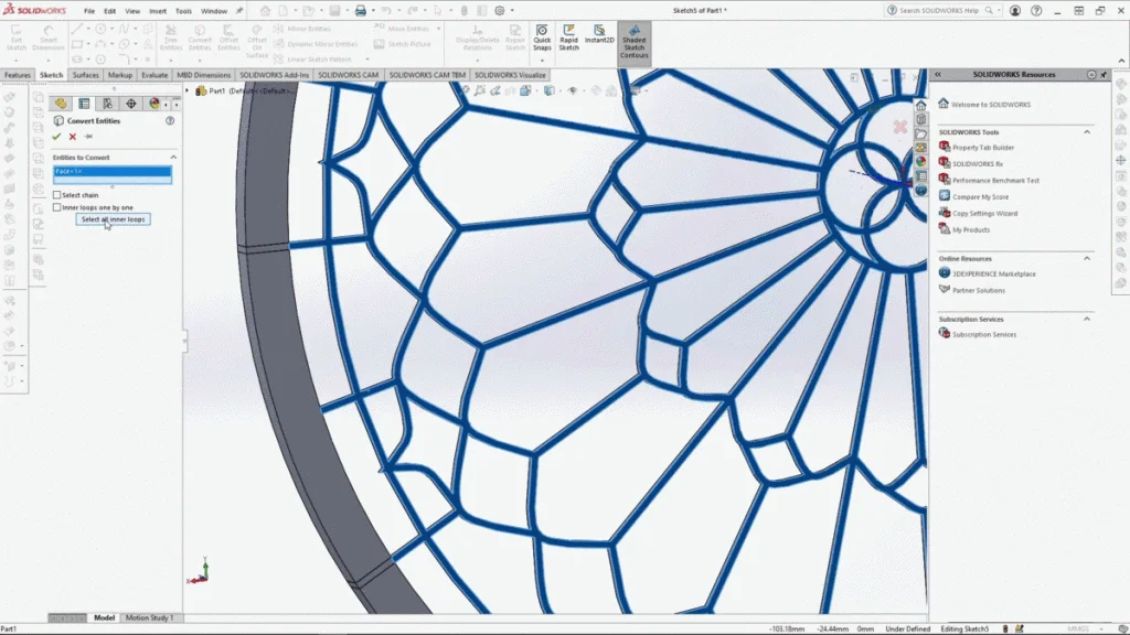 Once the inner window frame was finished and in one whole piece or body, I needed to create a sketch of all the inner loops to create the individual window panes of glass. To do this quickly I used Convert Entities: select all inner loops. This tool can save you so much time, rather than having to select individual loops at a time, I was able to convert all the inner shapes at once, allowing me to simply extrude all the individual glass panes.