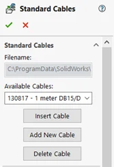 From the Standard Cables property manager, you get the options as seen on the left. You can either select a pre-existing cable to insert into your design, or you have the option ‘Add New Cable’ where you can configure a new cable to your specification. This new cable will be automatically added to your library for future use.
