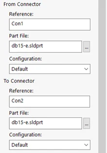 Next up is specifying the connectors that will be used for this cable. The connectors can be given a reference which will be used while inserting the cable into your design. We can then assign the part file for the connector. As you can see from the image on the right, we can specify the ‘From Connector’ and the ‘To Connector’. Finally, we can specify what configuration of the part file you want to use. This way if you have a connector configured with different numbers of pins then we can select the appropriate on for this cable configuration.