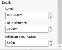 The final stage to configuring your cable is defining the details of the cable itself. For this we can define the cable length, diameter, and minimum bend radius. Once you have done this all that is left to do is hit the green tick and your cable has now been added to your library and is ready to be inserted into your design.
