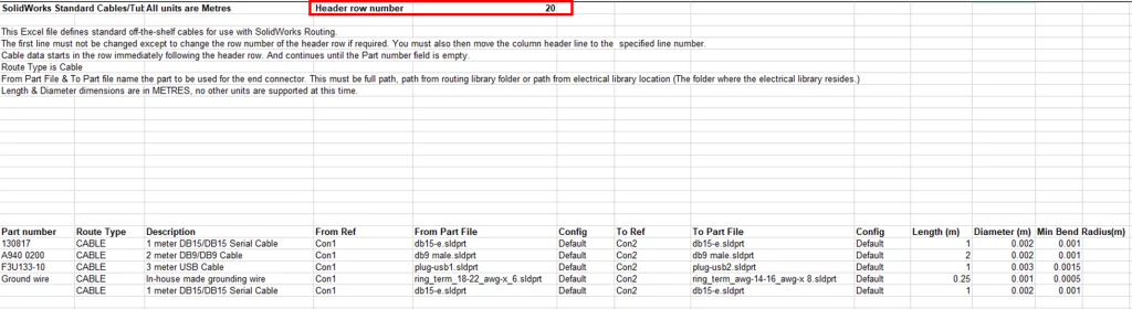 As previously mentioned, Microsoft Excel can also be used to setup the Standard Cables that you require. To access the Standard Cables excel file, you can find the file location specified in the Routing Library Manager. The default location for this is -C:ProgramDataSOLIDWORKSSOLIDWORKS 20XXdesign libraryrouting.