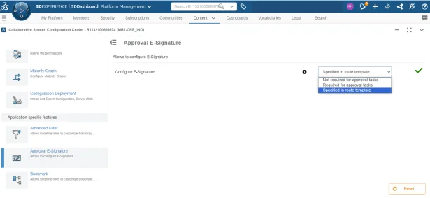 Log in to the 3DEXPERIENCE platform with administrative credentials and navigate to the Platform Administration dashboard. This console is where you can configure various settings, including those related to e-signatures. Now look for the Collaborative Spaces Configuration Centre present inside the Content tab. From the several row present find the ‘Approval E-signature’.