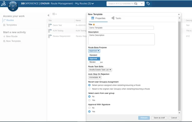 Go to Route management & create new route template of type ‘Approval’ Add a Title & description for Approval route base purpose & at the end select approval with Signature.