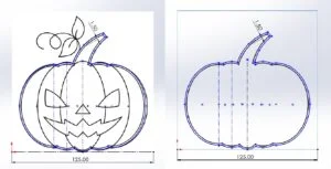 I find SOLIDWORKS sketching to be easy once you’ve got to grips with what I call the shortcut tools such as mirroring, patterns (Linear and Circular) and the use of centerlines for reference points. For the pumpkin design I set a centerline across the broadest part of the pumpkin before adding a central oval and then repeating this process twice more to get the outer shape locked in, from here I used the power trim tool to quickly remove all the extra non needed lines. With one half of the pumpkin sketched out I simply mirrored this around the centerline. The last part of this design was to add the stalk of the pumpkin, again tracing the outline of the sketch picture using some splines. From here I used the offset command to create a second line 1.5mm apart from the original sketched line.