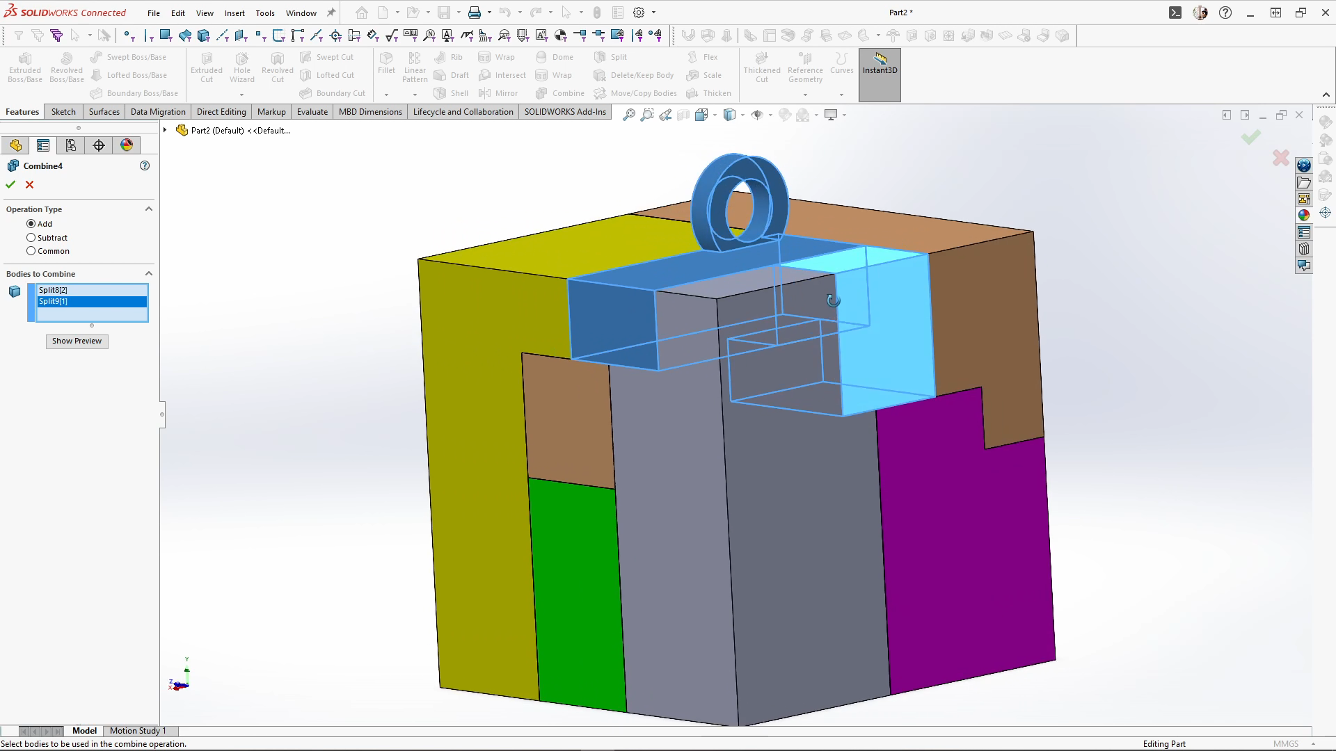 I also used the Direct Editing tab and the Move Face feature to adjust one of the surfaces, and added a small Cut-Extrude to create an interior indent based on the real puzzle piece. As the number of bodies increased, the Isolate tool became especially useful. Isolate allowed me to temporarily hide everything except the bodies I needed to edit, making it much easier to check geometry, apply appearances, or perform Combine operations without visual clutter. It also helped when adjusting faces or creating cut features on specific parts.